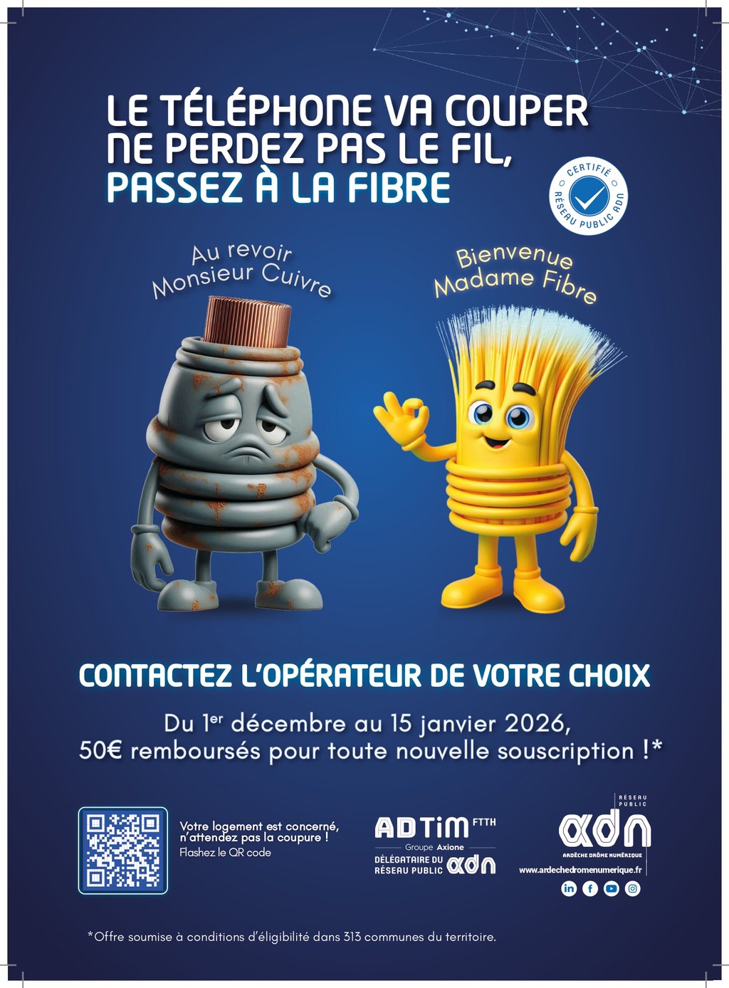 Afin d’encourager les usagers à franchir le pas, et ce, dans un contexte ou l’extinction du réseau téléphonique cuivre est annoncée, nous lançons sur votre commune une offre exceptionnelle de remboursement de 50 € pour toute première demande de raccordement à la fibre, effectuée entre le 1er décembre 2025 et le 15 janvier 2026.