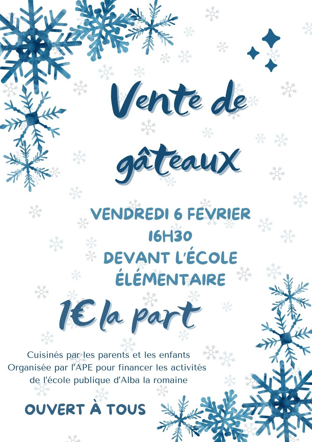 Une vente de gâteaux aura lieu ce vendredi 6 février à 16h30 devant l'école élémentaire.