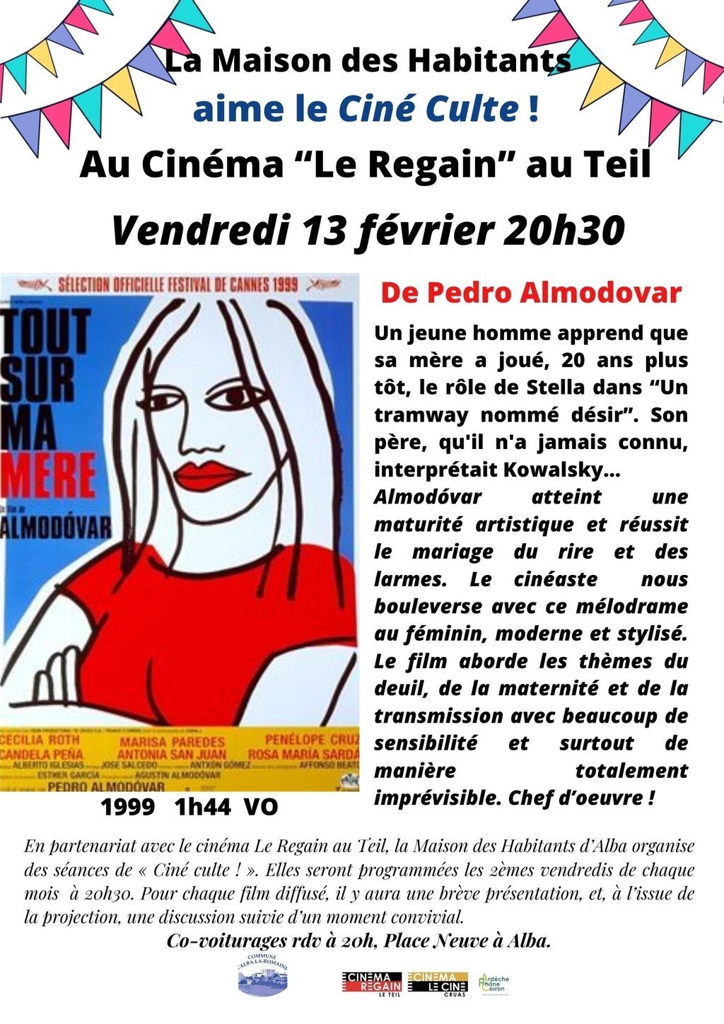 Les bénévoles de la Maison des Habitants d'Alba la Romaine vous invitent à la séance de "Ciné Culte " au cinéma Le Regain au Teil le vendredi 13 février 2026 à 20h30 !