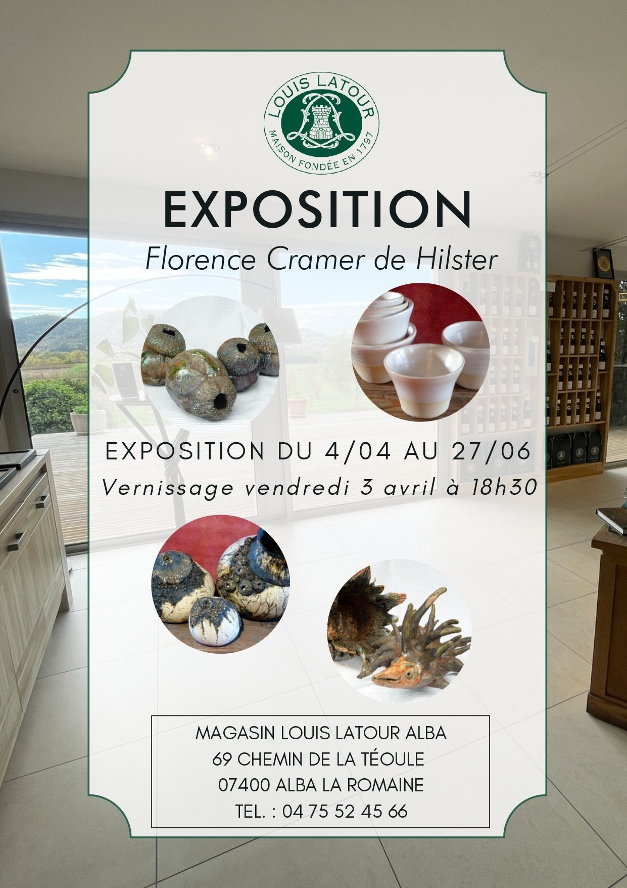 Nous serions ravis de vous recevoir en toute convivialité le 03/04/2026 à 18h30 à la boutique Louis Latour à Alba la Romaine pour l'exposition Florence Cramer de Hilster.