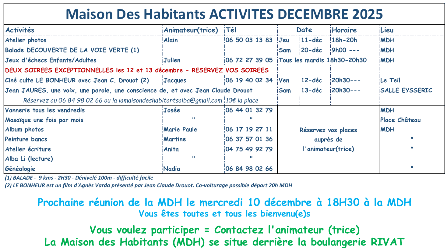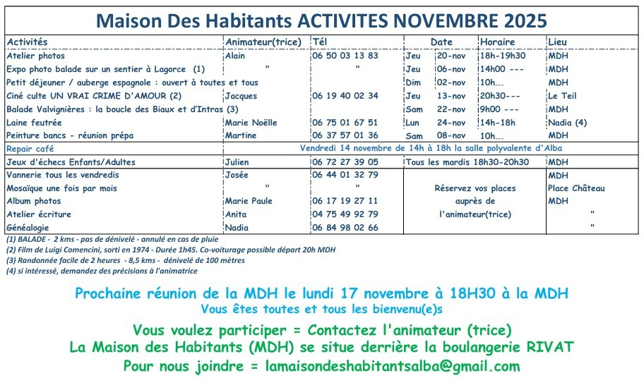 Un calendrier est diffusé chaque fin de mois pour faire part des activités du mois prochain. Et les communications sont relayées sur le site https://www.alba-la-romaine.fr/page/lamaisondeshabitants, intramuros, facebook...